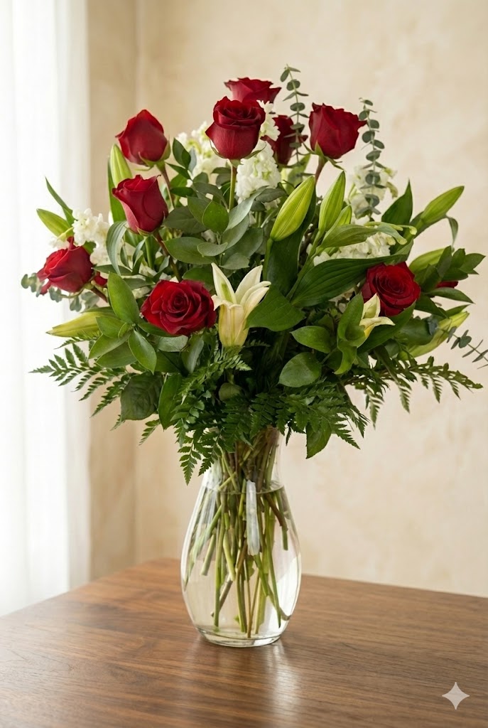 As it name says; a perfect mix of long stem Premium Roses, Stocks and Lilys on a vase of fresh greens and eucaliptus..